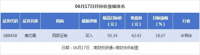 6月17日,券商给予上市公司目标价共1次,按当日收盘价计算,美芯晟的目标价涨幅为18.67%专业的股票门户网站,属于半导体行业。