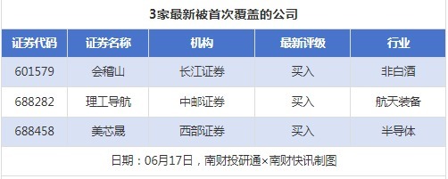首次覆盖方面,6月17日券商共给出了3次首次覆盖,其中会稽山获得长江证券给予“买入”评级,理工导航获得中邮证券给予“买入”评级,美芯晟获得西部证券给予“买入”评级。
