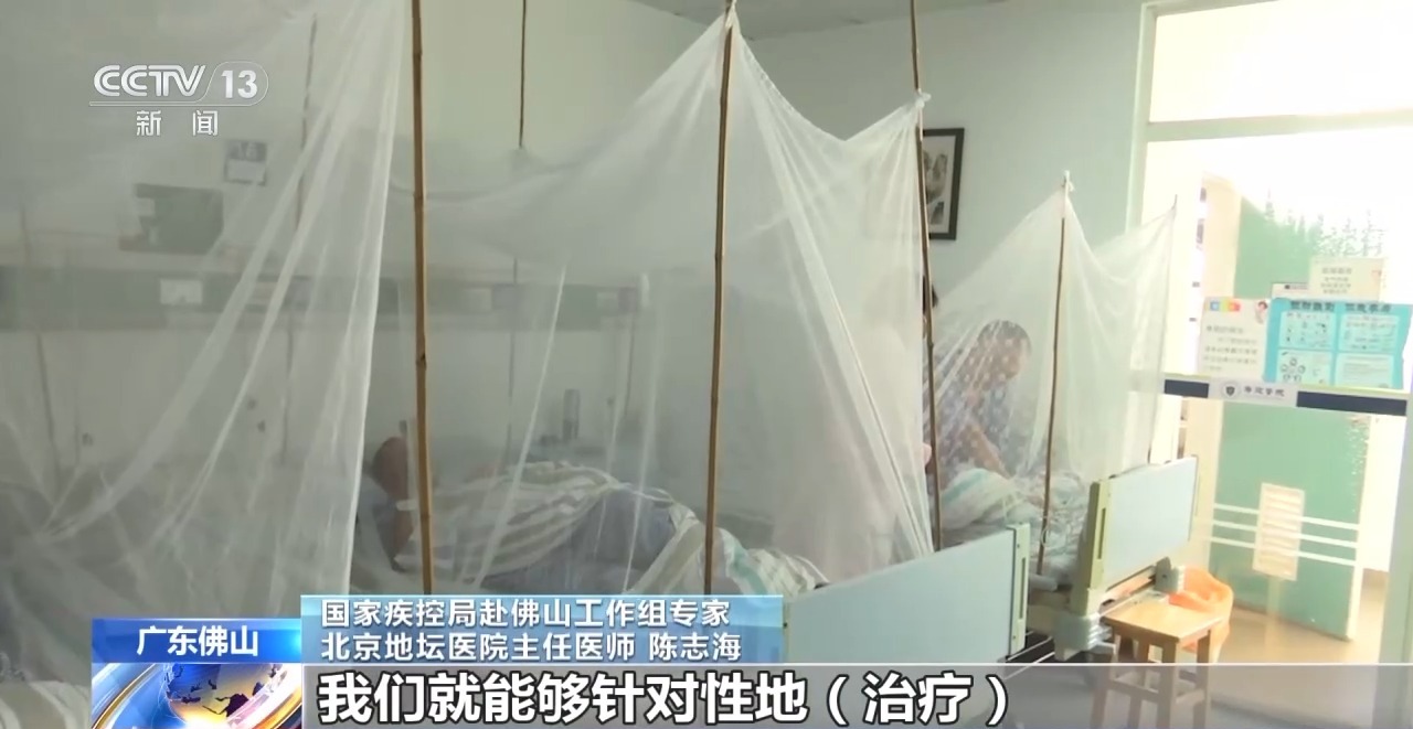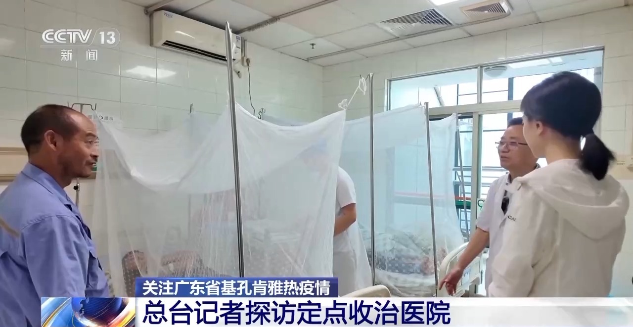 总台央视记者 郑怡哲:目前,广州市定点收治基孔肯雅热的医院对于有发热、关节疼痛以及皮疹这类症状的患者,会问询近期的旅居史,如果有疑似的患者会进行登革热与基孔肯雅病毒检测,来确定病情。像感染科的病房,统一配备了蚊帐、防蚊门帘和纱窗等,可以有效阻断确诊病例的再次传播。